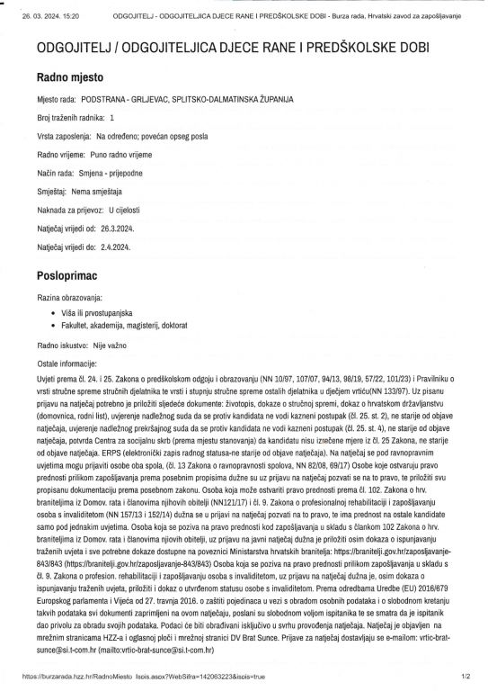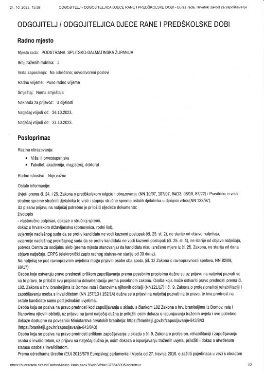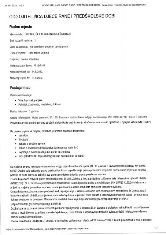 Natječaj za zapošljavanje - odgojitelj/odgojiteljica ŠIBENIK