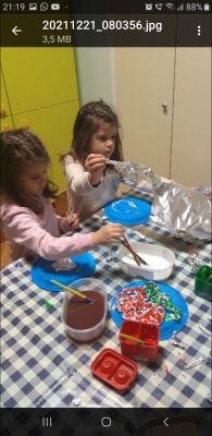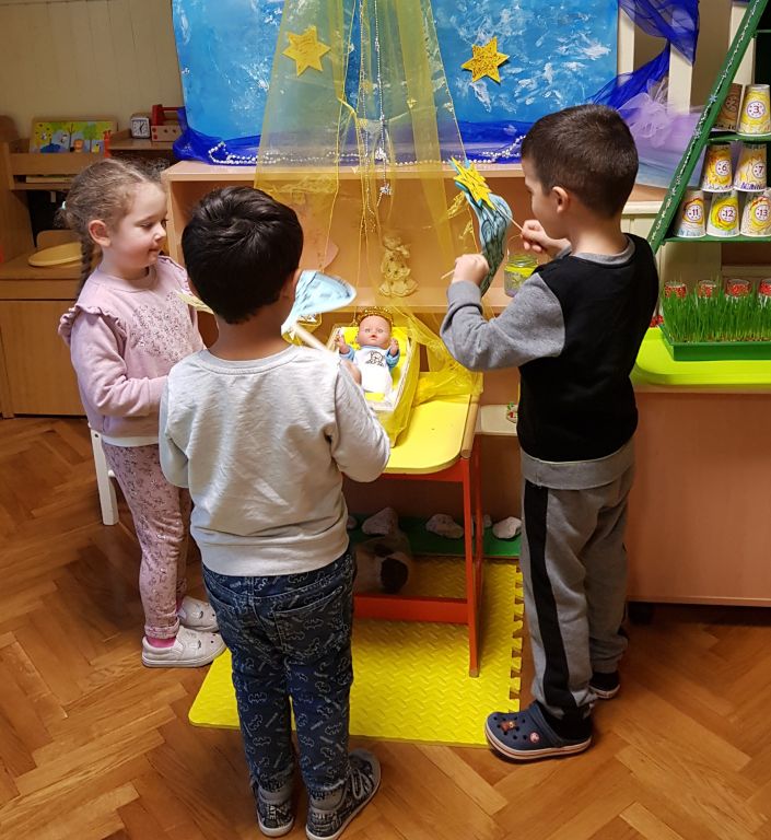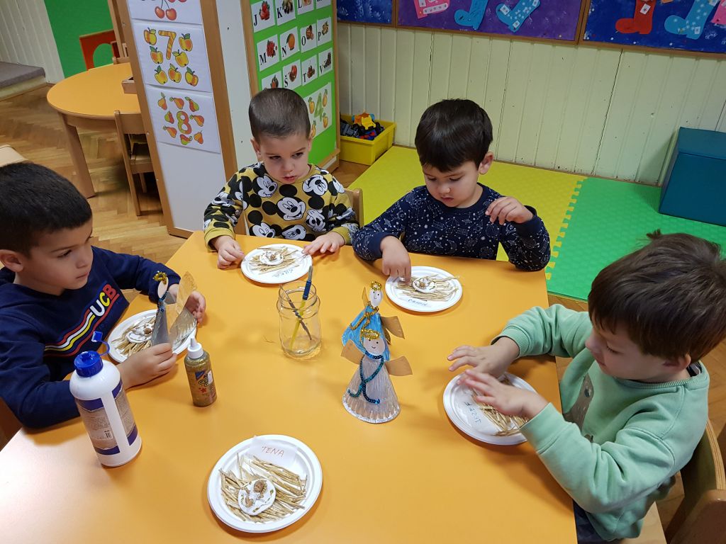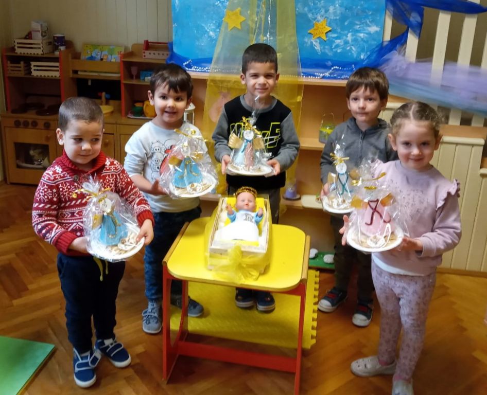 S velikom radošću izrađivali su raspjevane anđele koji su pastirima javili radosnu vijest. Njima su ukrasili vrtićki prostor a neke su ponijeli doma za svoje sobe . Vrlo brižno pripremali su mjesto u sobi za malog Isusa„kojem će za rođendan pjevati i plesati“, rekla su djeca.