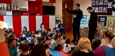 Župnik je djeci na njima razumljiv način održao malu katehezu, predočivši im krsnu svijeću i krsnu haljinu kao simbole krštenja. Objasnio im je njihovu simboliku te izgovorio formulu dijeljenja sakramenta samog krštenja.