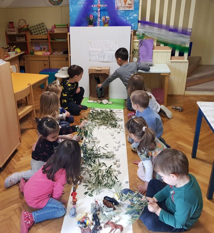 Poticaji su im bili: posjet i istraživanje cvjetne livade u vrtu, branje proljetnog mirisnog cvijeća, maslinove grančice, posuda s laticama cvijeća u vodi, fotografije Isusa na magarcu i djece s palminim granama, slika ulaza u grad Jeruzalem, gumena igračka magarca.