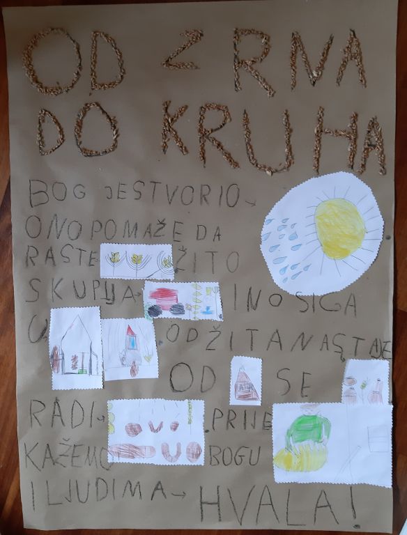 U našem Vrtiću, kao i svake godine u mjesecu listopadu, obilježavaju se Dani kruha i zahvalnosti za plodove zemlje uz zahvalu Bogu za sve plodove kojima nas dariva jesen. Djecu smo upoznali s procesom nastanka kruha uz igru u centru pekare koja je bila vrlo sadržajna i bogata pekarskim proizvodima koji su nastali radom marljivih dječjih ručica. Djeca su spoznala važnost kruha za sve ljude i sjetila se u svojim molitvenim zahvalama svih onih koji nemaju kruha i nisu ga u mogućnosti blagovati svaki dan.
