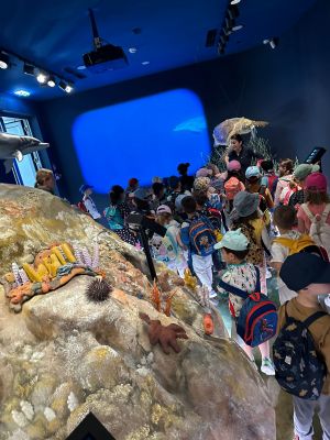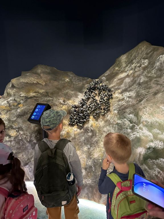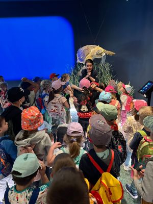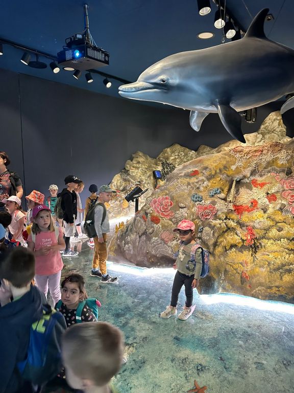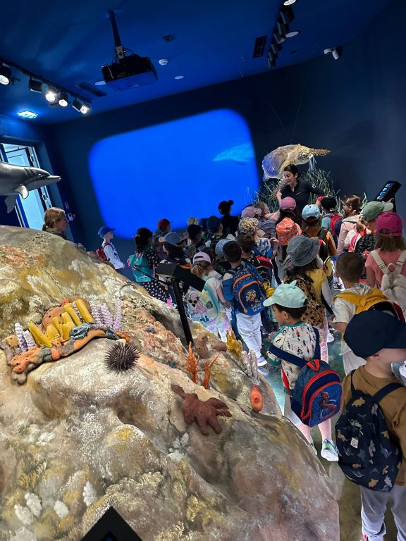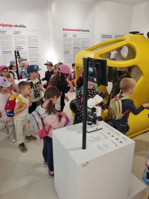 Edukatorica, gospođa Zrinka nas je srdačno dočekala i na zanimljiv način objasnila djeci da rijeka Krka teče preko mora, o slojevima miješanja rijeke i mora, o savršenom fenomenu prijelomnog vala koji možemo vidjeti i u oceanu, a i u oblacima. Edukatorica nam je pričala o tvrđavi sv. Nikole, špilji – crkvici sv. Ante i o nastanku našeg grada Šibenika. Otplovili smo u daleku prošlost prije dvadeset tisuća godina kad je kanal bio kanjon, kad otoka nije bilo, a u kanalu su bili slapovi rijeke Krke i koje dokaze i fosile imamo. Mali znanstvenici su čuli priču o nevidljivim svjetovima u moru, koliko ih ima u jednoj kapljici mora. Saznali smo koliko vode ima na našoj planeti, u našem tijelu i što sve utječe da se more diže i spušta i kako čitamo uređaj mareograf. Vidjeli smo uvećane planktone, nevidljive lutalice na vodenom zidu uvećane tisuću puta. Nakon zanimljive priče o patkicama koje su oplovile svijet i jednom jogurtu kojemu se nije išlo od kuće, naučili smo kako buka smeta mnogim životinjama. Poseban doživljaj je bio kad smo ušli u prostoriju podmorja gdje smo vidjeli stanovnike tog čarobnog svijeta. Dočekala nas je glavata želva i dobri dupin i druge zanimljive vrste stanovnika podmorja.