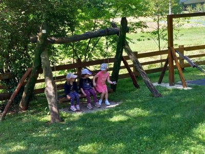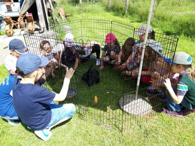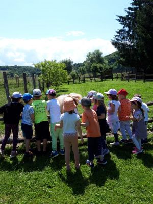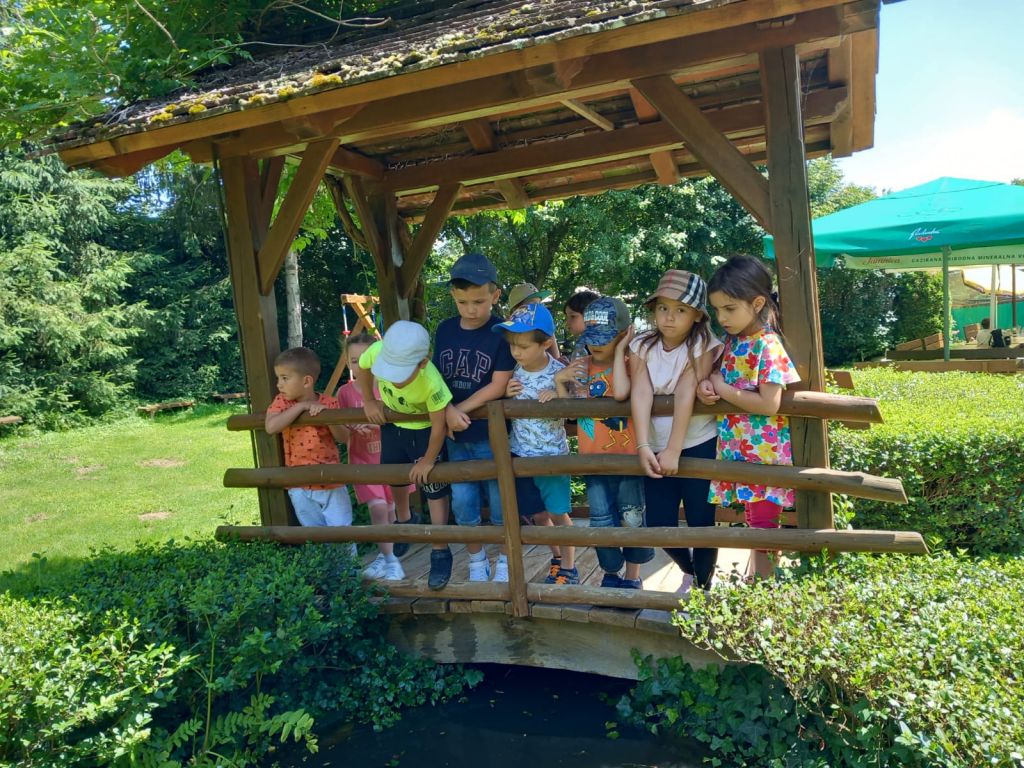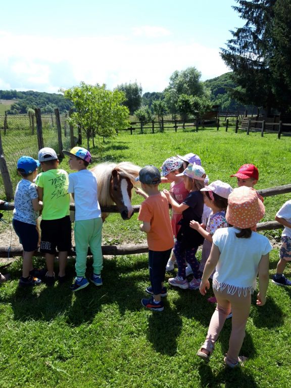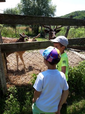 Odgojitelj Denis i odgojiteljica s. Julijana zajedno su se dogovorili da podjele djecu u dvije grupe zbog lakše organizacije i da se ne preplaše domaće životinje koje se nalaze u izletištu. Tako su u prvoj skupini, seosko domaćinstvo i životinje išle pregledati naši predškolci sa odgojiteljicom, dok su djeca srednje dobi bila s odgojiteljem u obiteljskom parku. Predškolci su dakle prvo mogli upoznati život purana, seoskih kokoši i pijetlova u njihovom seoskom staništu kako zajedno s patkama kljucaju zrnje. U drugom staništu su gledali jelene, srne, srndaće i srodnu divljač, vidjeli su kako oni pasu travu i naučili su da jelenima rastu novi rogovi kada im ispadnu. Vlasnik izletišta je djeci dao kruh koje mogu dati jelenima za hranu. U prostoru za ptice, djeca su imala priliku upoznati golubove pismonoše, i naučili kako to pismonoše znaju kamo moraju sletjeti da donesu pismo. Djeci se posebno svidio zec, i kunić u malom odvojenom prostoru pa su ga svi zajedno pogladili po glavici.Na livadi, djeca su upoznali konja Cezara, gdje im je vlasnik izletišta objasnio da je konj najčišća seoska životinja, koja ljudima služi za jahanje i pomoć u polju, a posebno im je zanimljivo bilo spoznaja da konj spava na nogama. Kada su svi pomazili konja, hrabrija djeca otišla su do kraja seoskog imanja i pogledali vjetnamsku svinju i divlju svinju u njezinoj nastambi, kako one izgledaju i što svinje jedu. Nakon razgleda su predškolci došli do trampolina gdje su predškolci skakali i zadovoljili svoju potrebu za kretanjem, a druga djeca su zaigrala stolni tenis. Potom su predškolci otišli s odgojiteljem u obiteljski park, a djeca srednje dobi su prošla seosko imanje i vidjeli sve žvotinje kao i njihovi stariji prijatelji sa s. Julijanaom.