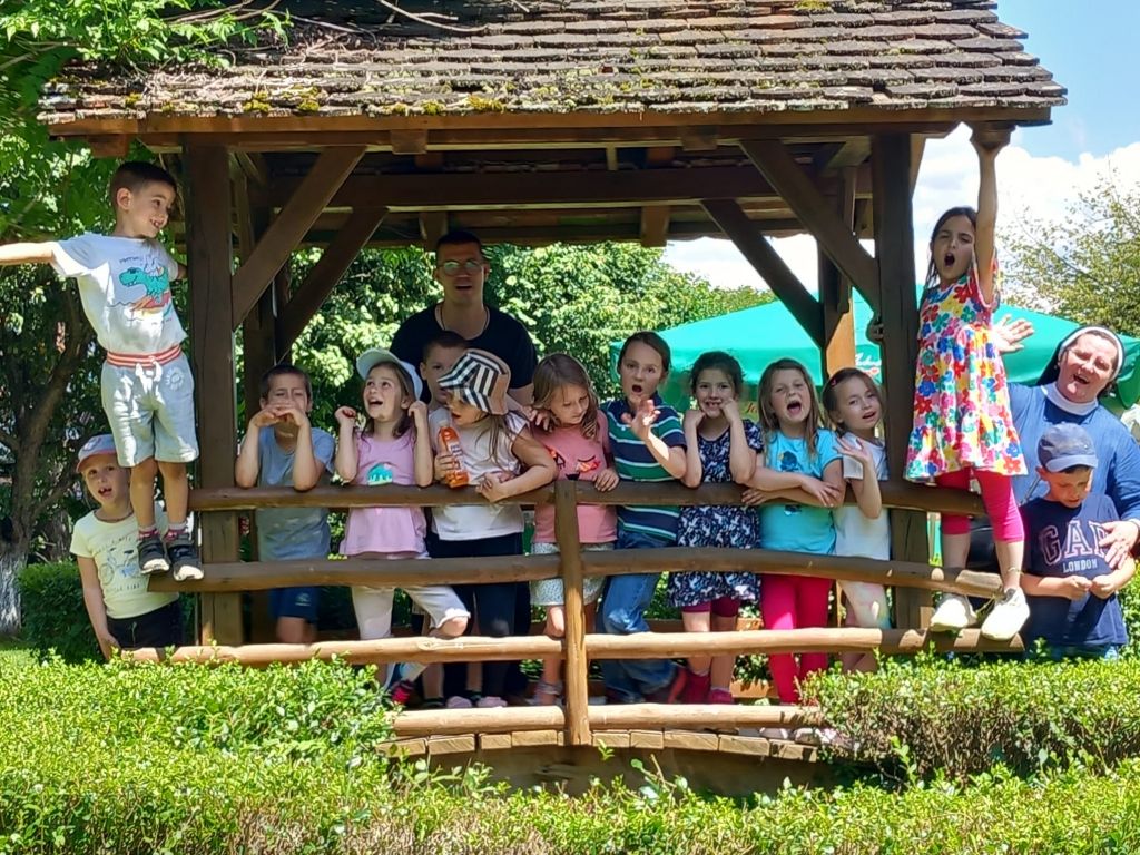 U 12.30 sati je počeo ručak, kojeg smo nakon zajedničke molitve u kojem smo zamolili Nebeskog Oca neka blagoslovi i svima providi kruh po nama koji ga nemaju, jeli pečeni odrezak, krumpiriće, salatu, sok od bazge. Nakon ručka neumorni nastavili zajedničko vrijeme u igri i druženju u obiteljskom parku, a poneka djeca su s odgojiteljicom pošli do trampolina i na stolni tenis. U 14.30 sati smo pojeli ukusne palačinke, i onda je došlo vrijeme za oproštaj i morali smo se vratiti u vrtić. Djeca i odgojitelji su zadovoljni nakon predivnog dana, pozdravili svoje domaćine i ponovno smo se ukrcali u autobus. Jedan dječak je primijetio da mu je danas bilo toliko lijepo, da bi najradije ostao u vrtiću umjesto da krene u školu.