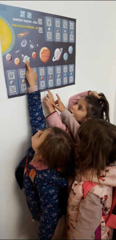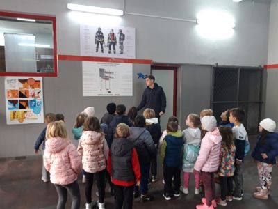 Vatrogasci su nas lijepo primili i odveli u hangar gdje drže vatrogasna vozila. Vidjeli smo kako izgleda intervencijsko vozilo, kako se oblači protupožarni kaput u punoj opremi. Pokazali su nam unutrašnjost vatrogasnog vozila, gdje se nalazi prva pomoć, kako izgledaju i rade škare za spašavanje u hitnim intervencijama. Djeci se posebno svidjela pneumatska dizalica koja može podići kamion uvis. U cijeloj prezentaciji posebno se istaknuo vatrogasac Mauro koji nam je živo objasnio kako izgleda dan u vatrogasnoj postaji i koji nam je objasnio kako se kod spašavanja od požara treba prvo javiti mami i tati i čim prije izaći na vanjski prostor, kako bismo pobjegli od dima i vatre.