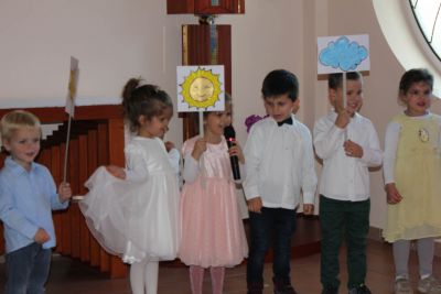 Bogati program otvorili su „Cvjetići“ živopisnim uprizorenjem vesele cvjetne livade, a najmanje „Ribice“ razveselile su i dirnule sve prisutne pjesmicom o suncu, zvijezdi i oblaku. Male „plave vile“ iz „Cvjetića“ izvele su, osim odlično pripremljenih recitacija i pjesmica, prekrasnu plesnu točku, a u zadnjoj točki, plesu su se pridružili i dječaci. Na kraju su nam naša djeca još jednom uputila najljepšu čestitku – radosnu pjesmu uz širok osmjeh.