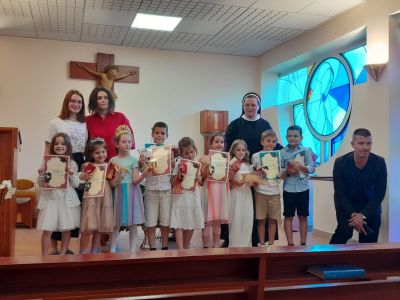 Voditeljica s. Julijana Vojković zahvalila je svim djelatnicima vrtića, a na poseban način je zahvalila odgojiteljima, sestrama i kuharici s. Nadi. Također zahvalila je roditeljima na iskazanom povjerenju, ljubavi i suradnji s odgojiteljima. Na kraju misnog slavlja svećenik je blagoslovio prigodne poklone i diplome za uspomenu, nakon čega su ih odgojitelji Lea, Lucija, Denis i s. Julijana djeci podijelili. Roditelji su osjetili da je trenutak da podjele odgojiteljima mali znak pažnje, cvijeće, pokoji dar i toplu zahvalu što smo kroz pedagošku godinu uložili mnogo truda i ljubavi u suradnju i odgoj njihove djece.