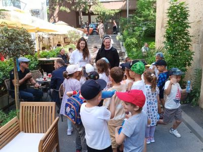 Kada smo krenuli prema vrtiću, ispred Kinoteke dočekali su nas dragi roditelji naših prijateljica Kijare i Noemi. Oni su nas počastili finom Cedevitom, koja nas je osvježila za nastavak puta do vrtića gdje nas je čekao ukusan ručak.