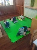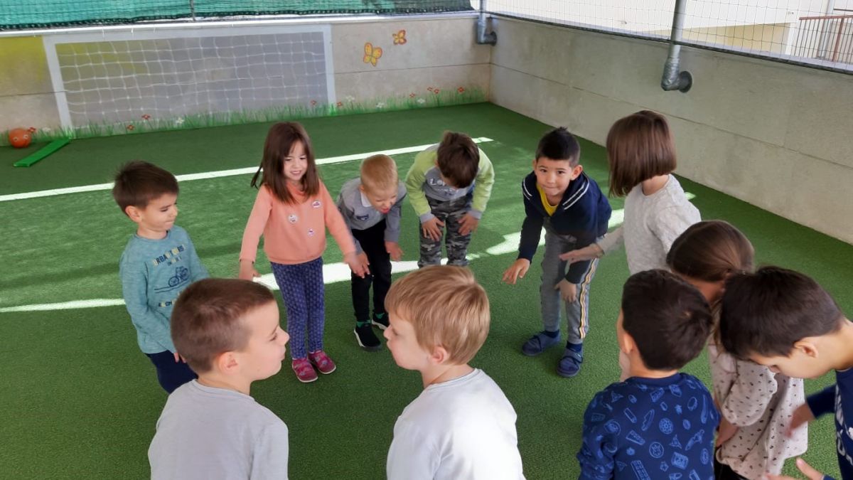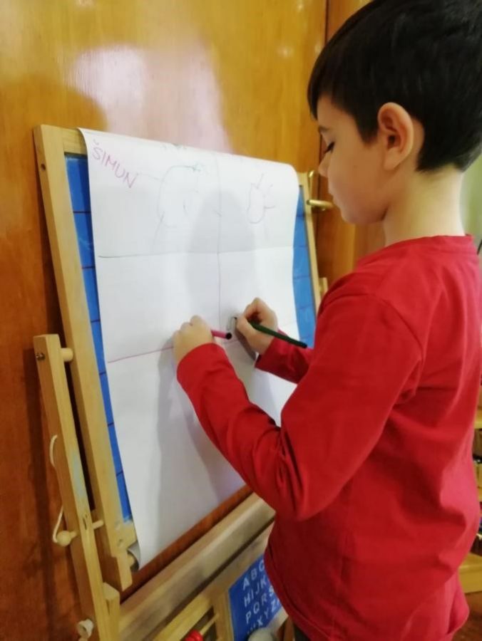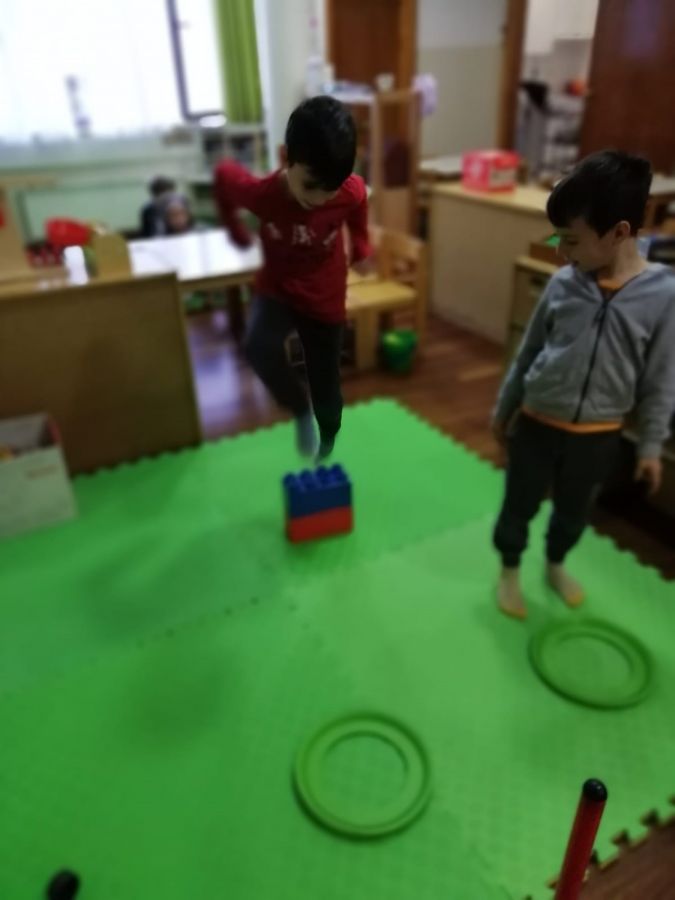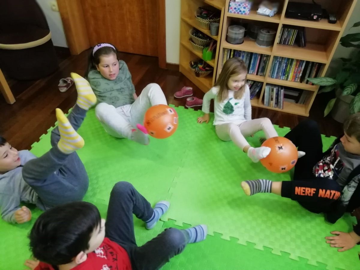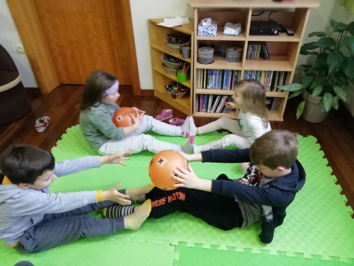 Dan smo započeli jutarnjom tjelovježbom u sobi dnevnog boravka: zagrijavanje, istezanje, razgibavanje. Zatim smo vježbali loptom, dodavali ju, hvatali na različite načine i jačali mišiće cijelog tijela. Napravili smo poligon: dodavanje i hvatanje teniskih loptica, preskakanje kocke i bacanje krugova oko stalka. Uslijedilo je crtanje s obje ruke istovremeno - jednake oblike i motive.