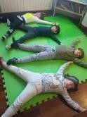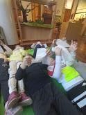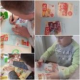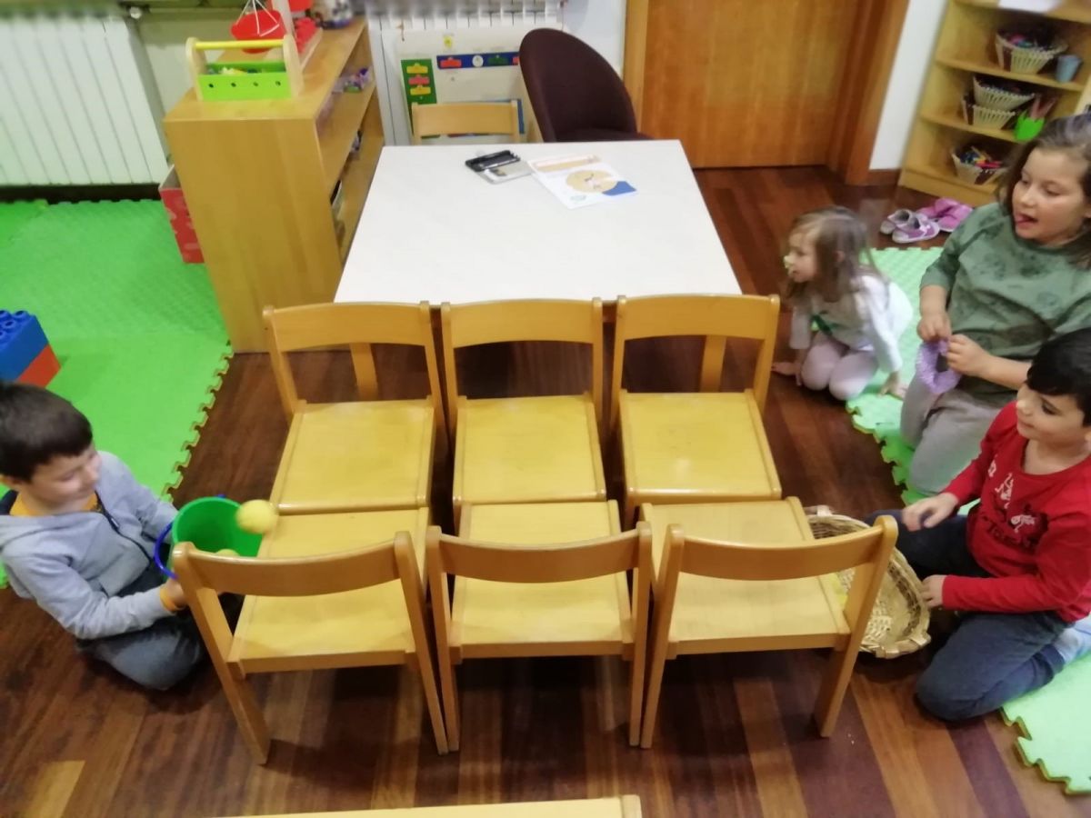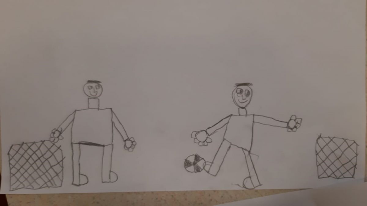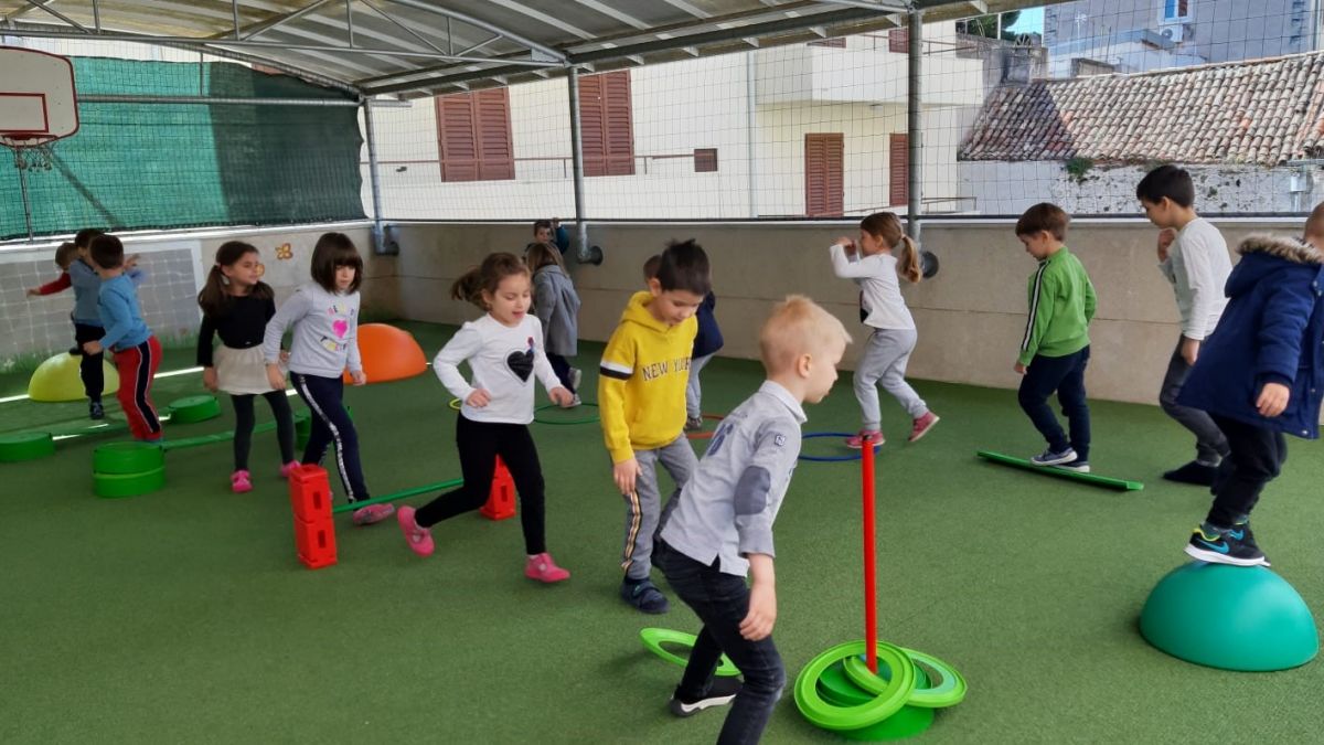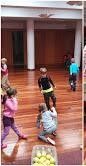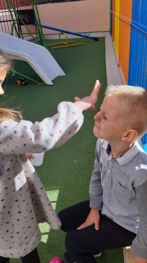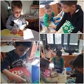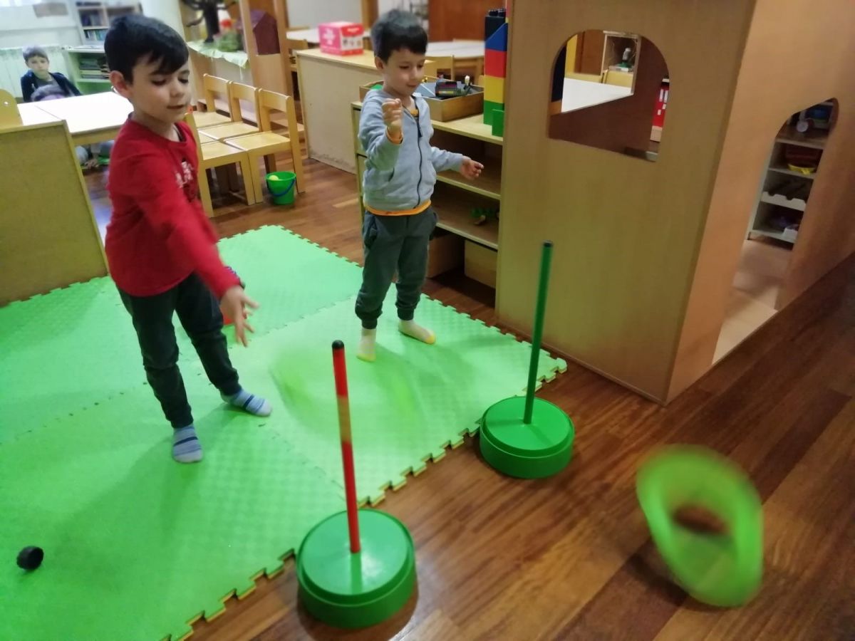 Dan smo započeli jutarnjom tjelovježbom u sobi dnevnog boravka: zagrijavanje, istezanje, razgibavanje. Zatim smo vježbali loptom, dodavali ju, hvatali na različite načine i jačali mišiće cijelog tijela. Napravili smo poligon: dodavanje i hvatanje teniskih loptica, preskakanje kocke i bacanje krugova oko stalka. Uslijedilo je crtanje s obje ruke istovremeno - jednake oblike i motive.
