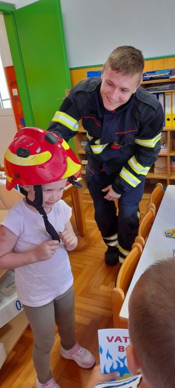Samim dolaskom vatrogasnog kamiona ispred vrtića zavladalo je oduševljenje među djecom. Vatrogasci su odjenuli zaštitna odjela, kacige i naočale. Objasnili su im kako svaki dio opreme štiti vatrogasca. Kaciga je djeci bila najzanimljivija, pa su je rado isprobavali. Objasnili su im i kako izgleda njihov radni dan i u slučaju požara izlazak na intervenciju te koliko su požari opasni. Pričali su im i o njihovoj posljednjoj intervenciji, gašenju požara na velikoj jahti u Primoštenskoj uvali.
