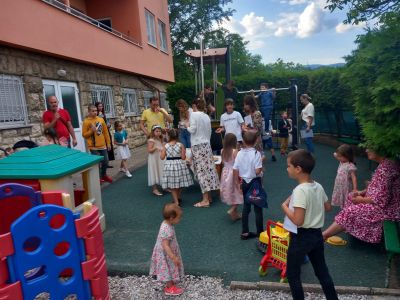 Na kraju voditeljica s. Julijana zahvalila je djeci i roditeljima, zbog iskazanog velikog povjerenja prema odgojiteljima u odgoju i obrazovanju njihove djece, istakla je izuzetnu suradljivost djece u izvršavanju vrtićkih obveza, usvajanje sadržaja i neizostavnoj igri. Zahvalila se odgojitelju Denisu, Lei, s. Ružici, pedagoginji Brankici Blažević, logopedinji Ani Vukasović, kuharicama s. Nadi i s. Martini, gđi. Mariji i gospodinu Ediju koji održavaju naš vrt čistim, urednim i funkcionalnim, zahvalila je računovodstvenoj voditeljici s. Mirjam, ekonomi vrtića s. Zvonimiri Nimac. Rekla je da su vrata našeg vrtića Brat Sunce uvijek otvorena. Nakon toga je gđa. Kata Sučić u dirljivom oproštajnom govoru zahvalila svim odgojiteljima na godinama truda, rada, strpljenja, darežljivosti srca. Zahvalila se s. Julijani koja je primila i odgojila brojne generacije djece s velikom ljubavlju. Odgojitelji su primili kao poklon zahvale prekrasne bukete, iako su pogledi zahvalnosti i topla riječ roditelja i djece bila najveći poklon koji bilo tko može poželjeti. Poslije dječje priredbe, iskoristili smo priliku za zajedničko druženje na prostorima vrtićkog dvorišta gdje smo se počastili slasticama, sokovima, i sladoledima.